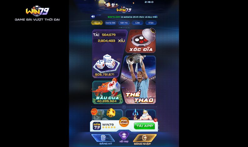 - Khi đăng ký Win79, hội viên sẽ được trải nghiệm một kho trò chơi đa dạng với nhiều thể loại khác nhau, từ các tựa game bài kinh điển như Tiến lên, Poker, Xóc đĩa cho đến các sản phẩm cá cược hiện đại như nổ hũ, tài xỉu hay cá cược thể thao trực tuyến. Bên cạnh đó, hệ thống còn không ngừng cập nhật cũng như nâng cấp chất lượng để mang đến trải nghiệm mượt mà và đầy sống động nhất cho bet thủ.