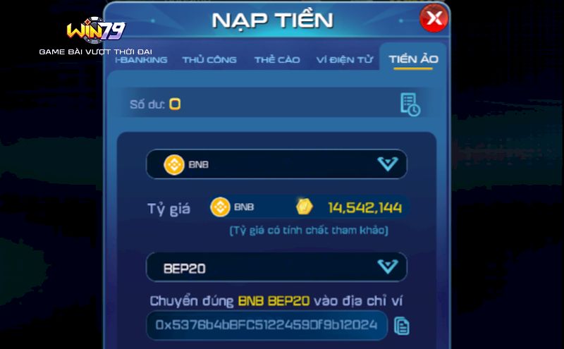 Tiền ảo đang ngày càng trở thành một phương thức thanh toán phổ biến, đặc biệt với những hội viên sử dụng các loại tiền điện tử như BNB, KDG, ETH hoặc USDT. Win79 hỗ trợ hình thức nạp tiền qua tiền ảo với tỷ giá cập nhật và an toàn.Bước 1: Chọn loại tiền ảoHiện tại, hội viên có thể nạp tiền vào Win79 thông qua địa chỉ mà cổng game cung cấp. Tỷ giá tiền điện tử này sẽ được hiển thị trực tiếp tại thời điểm nạp, giúp bet thủ theo dõi và lựa chọn thời điểm phù hợp để thực hiện giao dịch.Bước 2: Thực hiện gửi tiền vào- Win79 cung cấp địa chỉ ví tiền ảo cho từng lần nạp riêng biệt. Người chơi cần chuyển đúng địa chỉ ví được hiển thị để giao dịch thành công.
